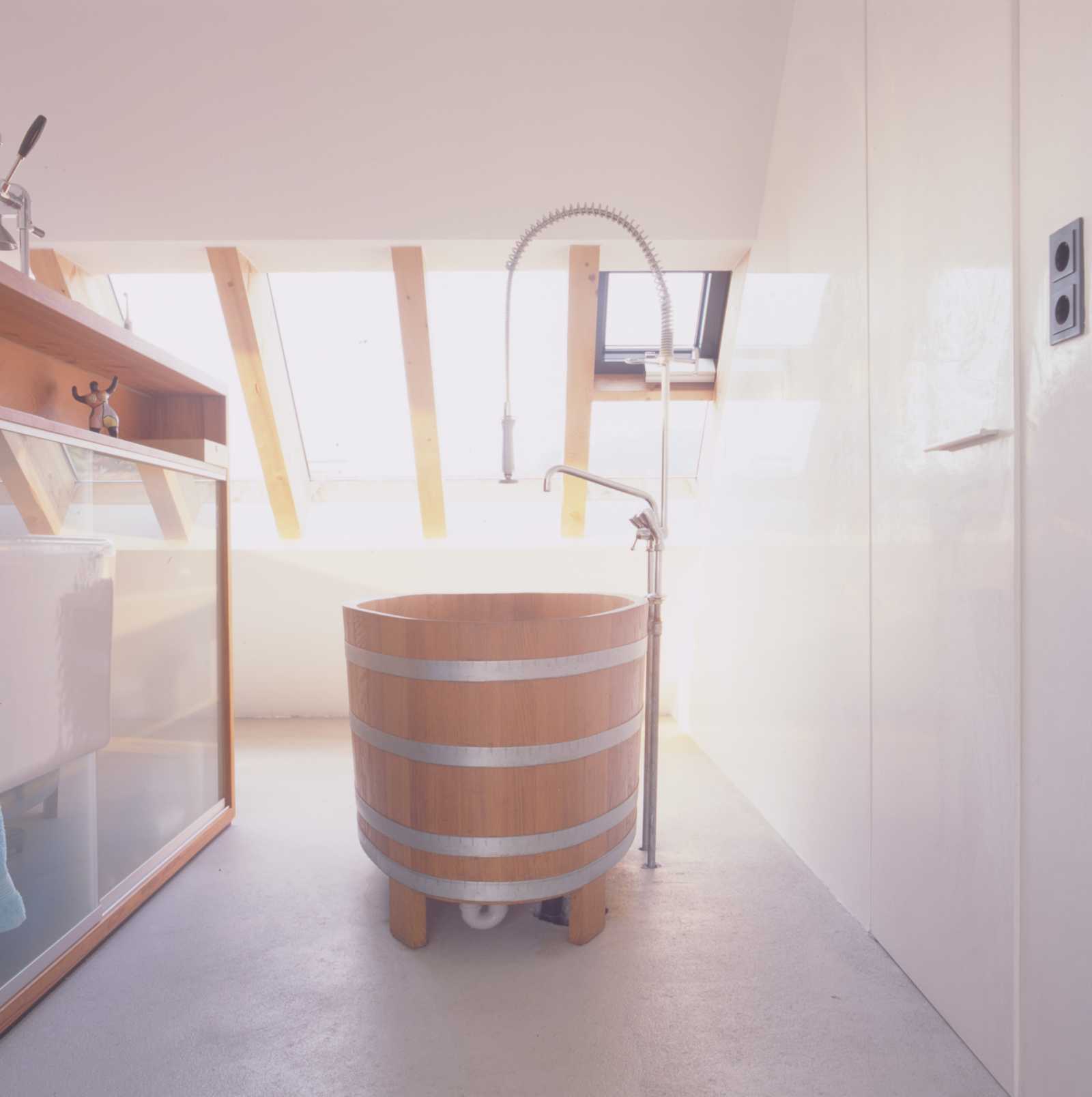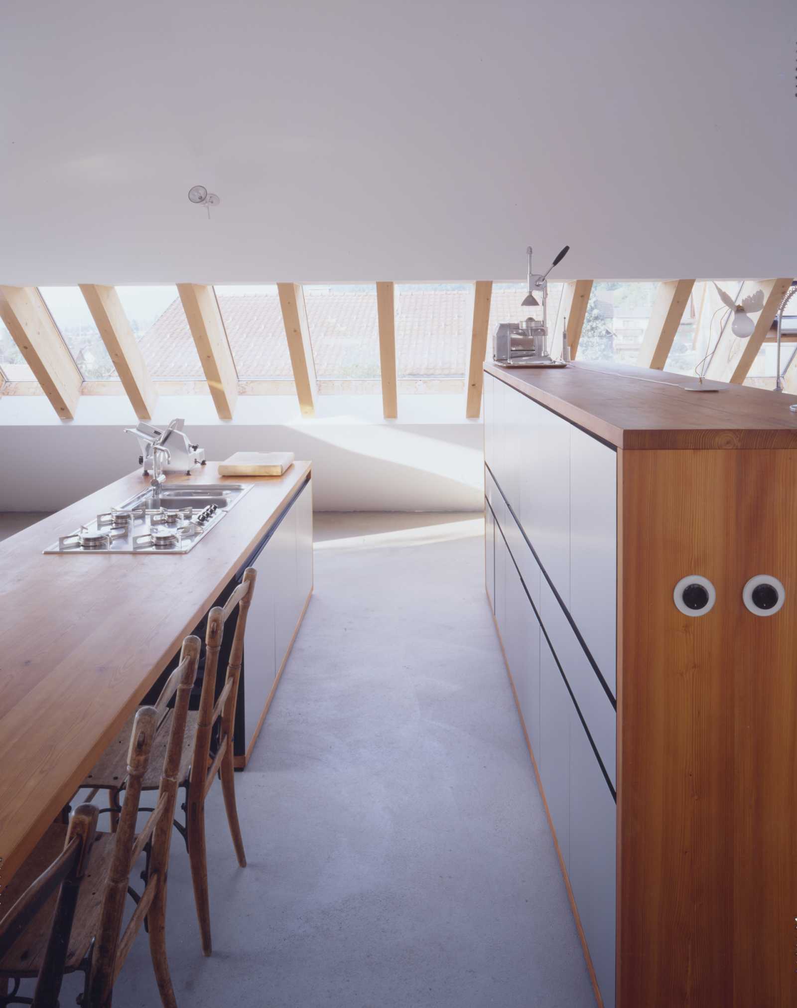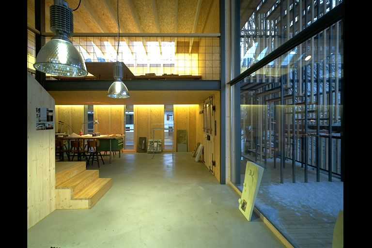 Mit dem Gebäudeinneren des Neubaus hat die Eigentümerin und Architektin unpathetisch fernab von Ideologien und Selbstdarstellung Raum zum Arbeiten und Wohnen geschaffen. Eine einfache Mischkonstruktion aus Stahlskelett und Leimbindern bietet einen offenen und variablen Grundriss auf mehreren Ebenen. Das Büro mit Ateliercharakter im 1. Obergeschoss bildet einen kubischen Raum mit differenzierten Raumhöhen, der durch eine eingeschobene Ebene horizontal gegliedert wird. Der Ausbau entspricht aus ökonomischen Gründen einem Edelrohbau mit sichtbaren Spannplatten und Estrichböden.