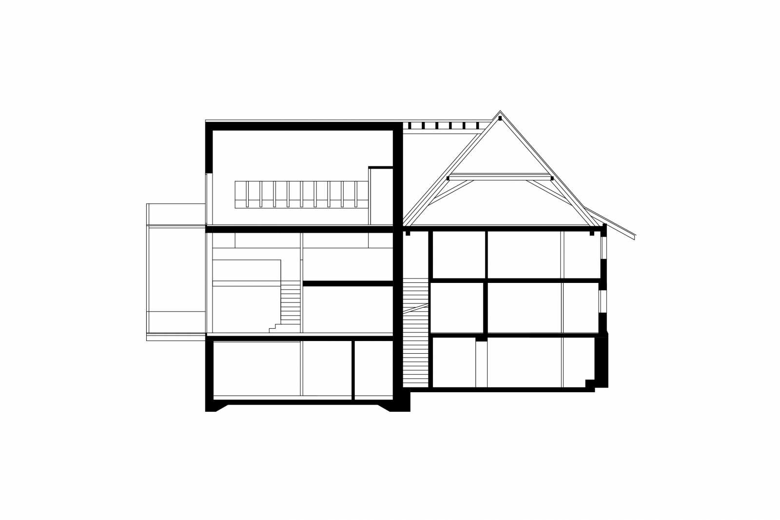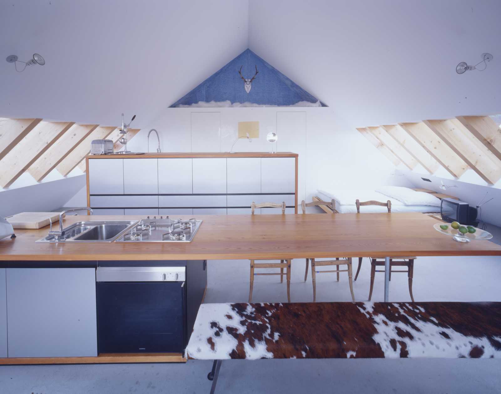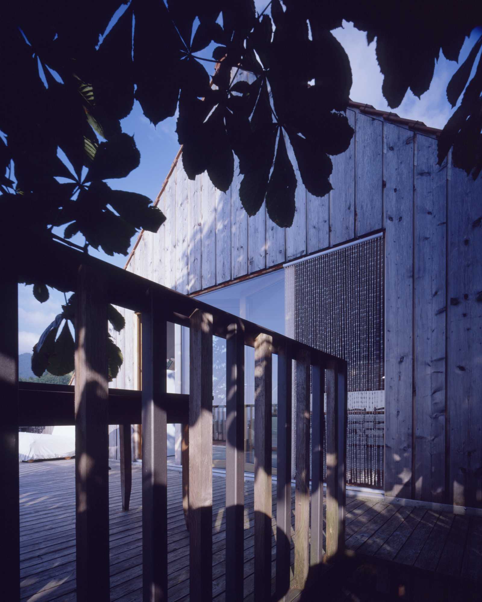 Die Belichtung erfolgt über einfache Dachflächenfenster zwischen der Leimbinderkonstruktion und über hohe schmale Fenstertüren. Ein großes Fenster an der Nord-Westseite erweitert den Raum nach außen zur vorgesetzten Terrasse und der Außentreppe als vertikaler Erschließung. Die oberste Ebene des Neubaus wird als Wohnung genutzt und nimmt das Thema Satteldach konsequent - bis hin zum von der Künstlerin Edith Grabher gestalteten Giebeldreieck „kruzefix“ - auf.